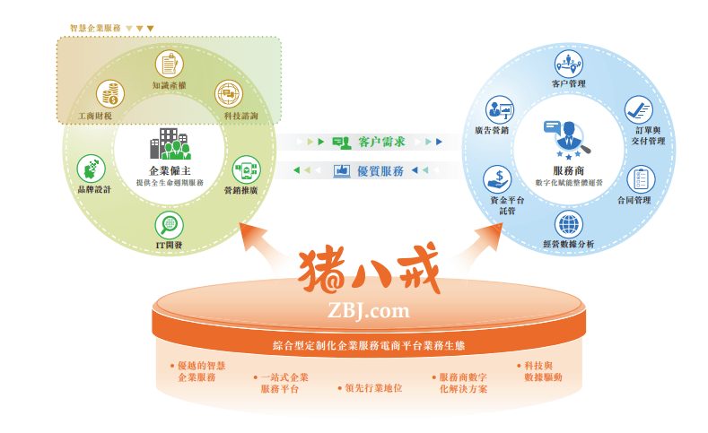 同时,猪八戒网开展“数据海洋+钻井平台”等战略,基于此前近10年积累的大数据,上线延伸服务,包括工商注册、代理记账、税务代办、资质代办、税务咨询、商标及版权等业务,基本形成了“智能企业服务”。