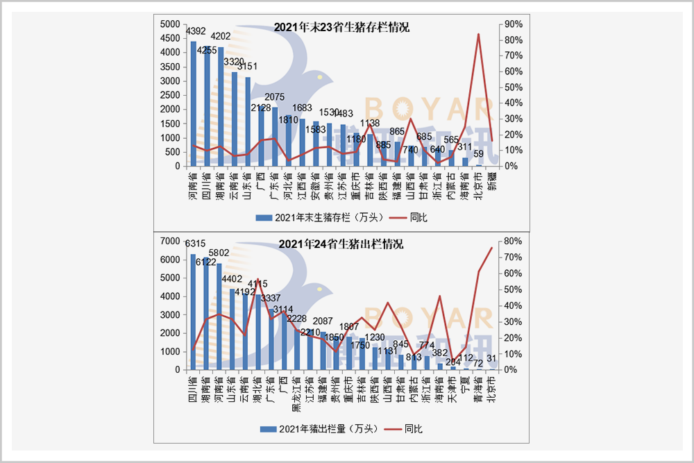 丰沛的粮食产量,还推起了一个下游产业。河南是生猪养殖大省和外调大省,常年生猪饲养量约占全国的十分之一,是全国重要的生猪生产加工供应基地。2021年,河南生猪存栏4392万头、出栏5802万头,分别居全国第一位和第三位。