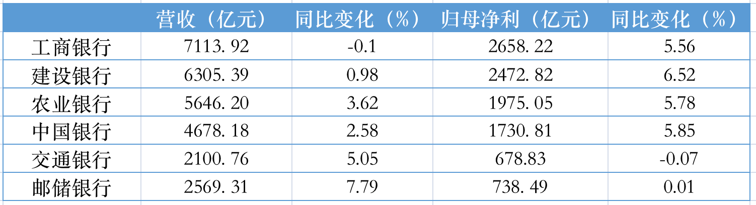 仅从三季度看,六大行营收增速放缓明显。工商银行、建设银行营业收入增速分别为-8.62%、-6.49%,去年同期增速为12.46%、14.12%;农业银行、中国银行、交通银行、邮储银行分别为-1.08%、0.97%、0.93%、3.43%。