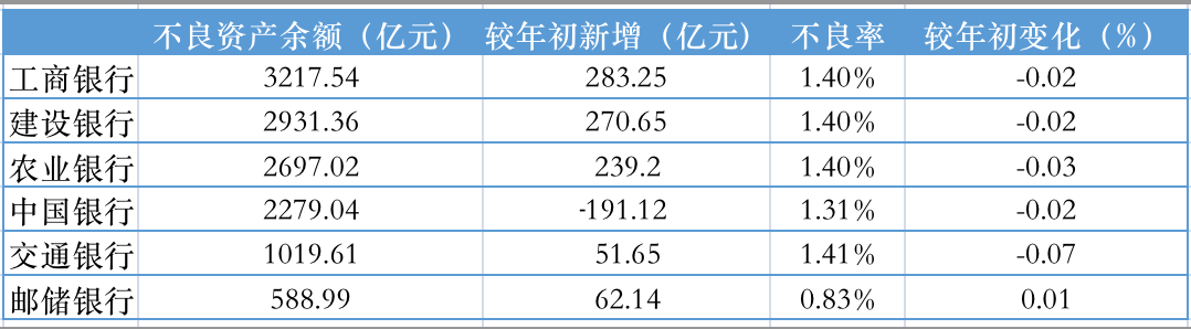 总体对比二季度看,六大行不良率环比保持不变或下降——截至6月末,工商银行、建设银行、农业银行、中国银行、交通银行、邮储银行不良率分别为1.41%、1.40%、1.41%、1.34%、1.46%、0.83%,三季度下降0.01、0、0.01、0.03、0.05、0个百分点。