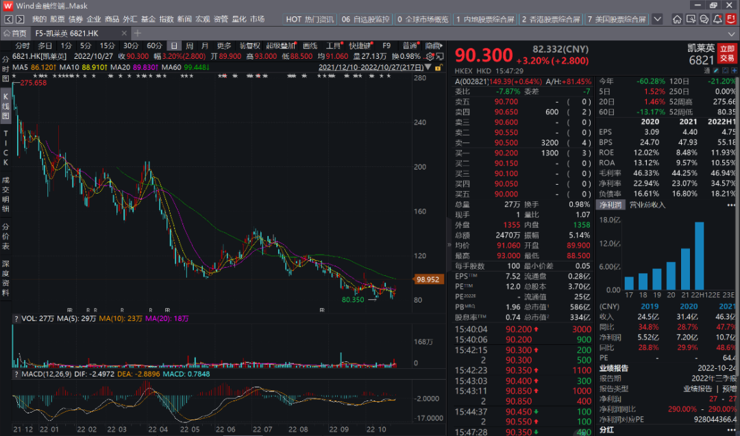以热门CXO抱团股 凯莱英 为例。2019-2021年涨幅分别为92%、131%和46%。今年截止2022年10月27,已暴跌52%。于港股上市的凯莱英更过分,不肖一年时间从275.66港元雪崩至90港元。