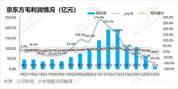 京东方 2022 年第三季度实现毛利 10.8 亿元,同比下滑 94.4%。毛利端的继续大幅下滑,主要由毛利率骤降两方面导致。