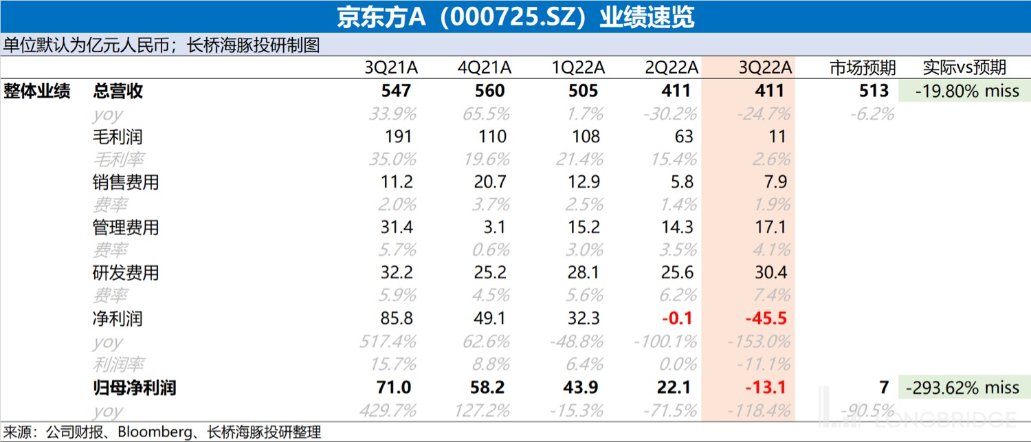 4、归母净利润:6 年来首次季度亏损。公司三季度归母净利润亏损 13 亿元,低于彭博一致预期(7 亿元),是公司 6 年来首次季度亏损。面板价格在本季度已经打破了现金成本,直接导致了公司本季度的亏损。