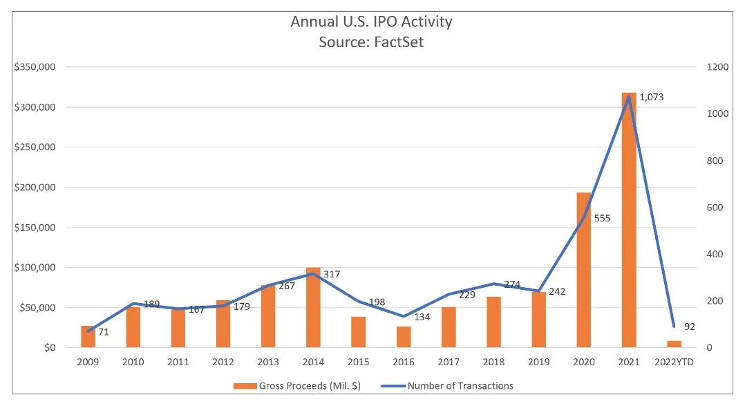 根据安永发布的《2022年二季度全球IPO趋势报告》,2022年上半年,美国两大交易所纳斯达克证券交易所和纽约证券交易所的IPO数量和融资规模分别较2021年同期大幅下降75%和94%。私募股权似乎都在尽量避开今年IPO市场。