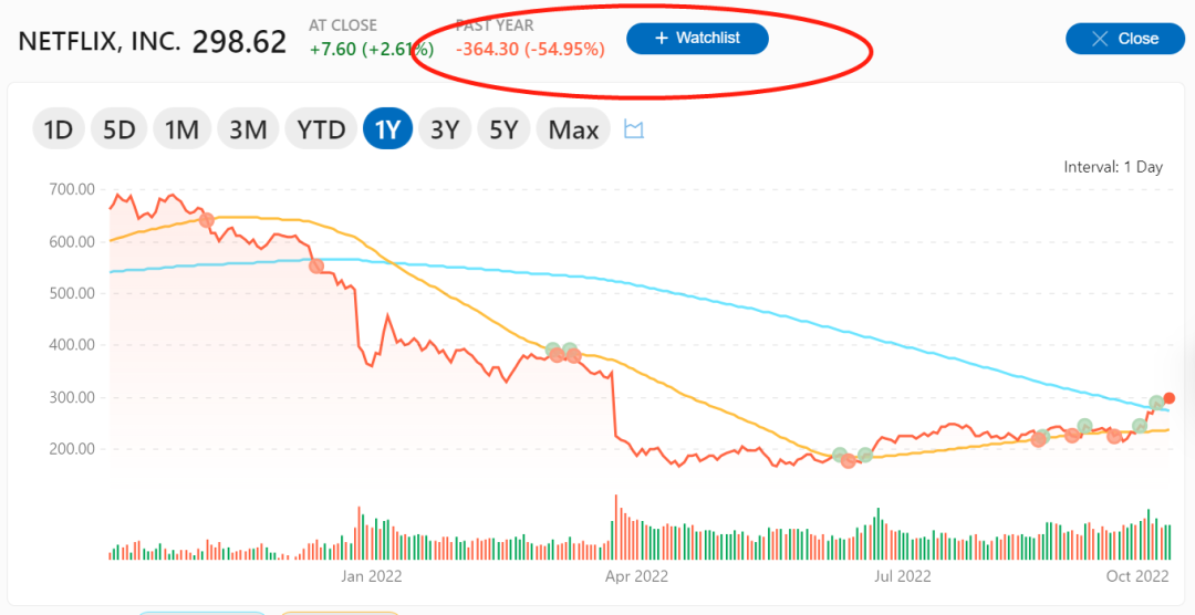 今年前两个季度,奈飞因为用户流失、裁员等负面消息缠身,公司市值蒸发两千多亿美元。最新数据统计,奈飞的股价相较一年之前跌了55%。