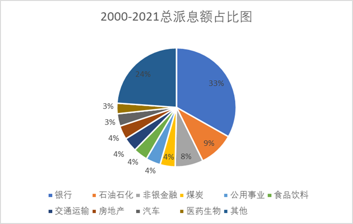 我们从统计的图表可以看出,银行业、石油化工、非银金融三个较为成熟的行业,派息分红占比达到了总体的50%。