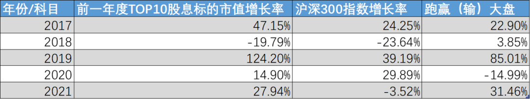 那么“狗股理论”对于咱A股来说,到底是“后车之师”还是”南橘北枳”呢?我们用2016-2021过去五年的收益为基数,进行了测算,选中每年股息率最高的前十个股,可以发现运用“狗股理论”,五年间仅有2020年跑输了大盘。