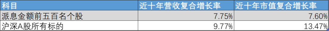 我们按照股息率前500取为样本,选取2012个股,统计了十年以来的营收增速、市值增速可以发现,往往高派息的标的增长比较慢,无论是营收还是市值,均低于市场同期,这也比较符合成熟企业的标签:低增速高稳定。