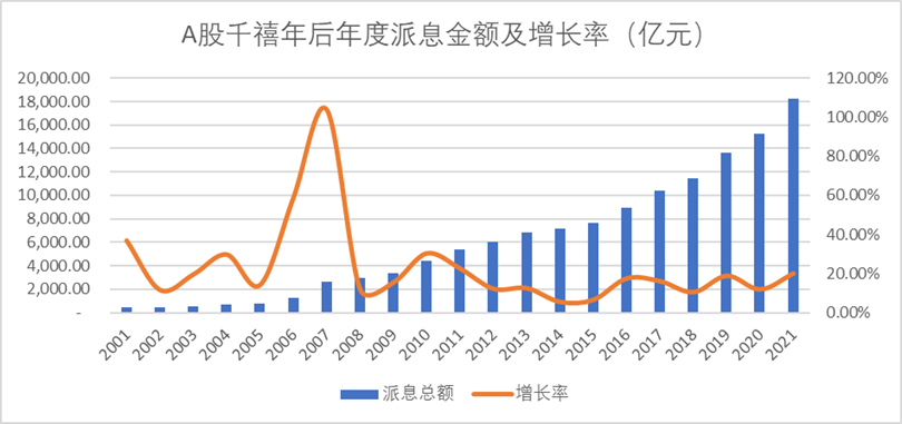 图:A股千禧年后年度派息金额及增长率来源:Choice金融客户端