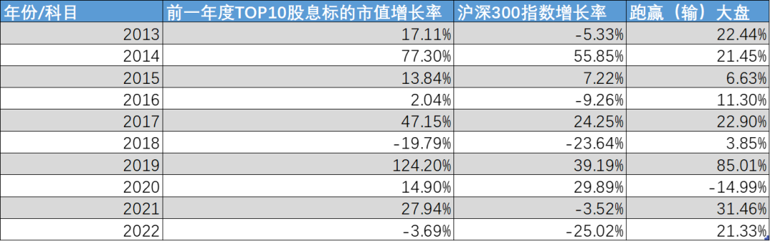 如果我们再将时间线拉长,选取近10年的“狗股”与沪深300做对比,可以发现十年间同样也仅有2020年“狗股”跑输了大盘。