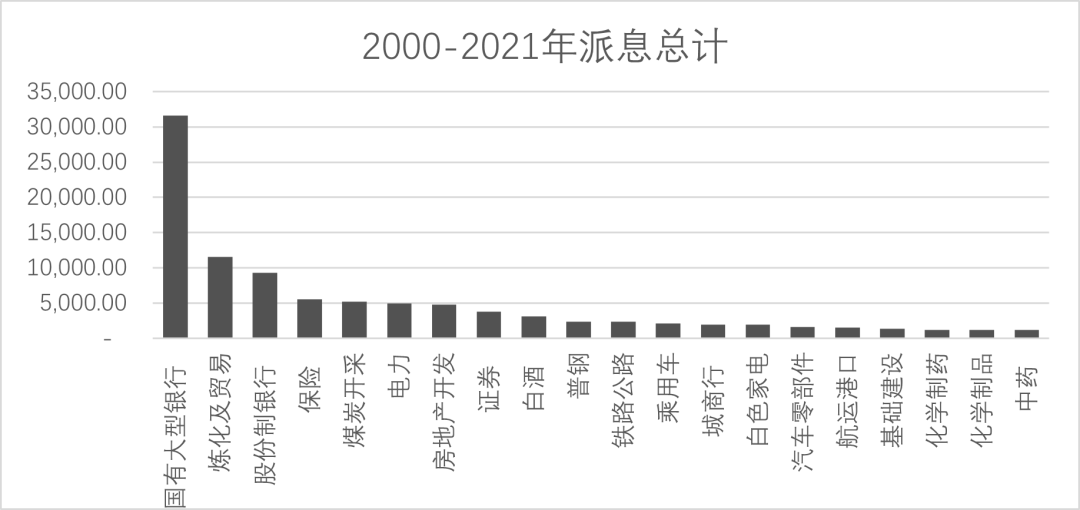 图:2000-2021年派息总计分行业(亿元) 来源:Choice金融客户端