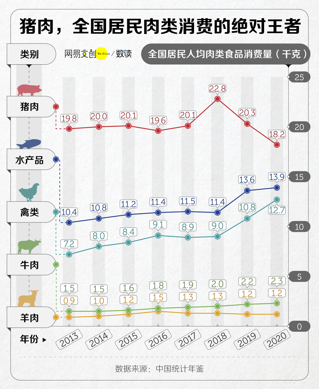 实际上,与其他肉类对比,中国人对于猪肉相当依赖。统计年鉴数据显示,2020 年全国居民人均消费猪肉为 18.2 千克,远远高出种类繁多的水产品以及其他肉类 [1]。