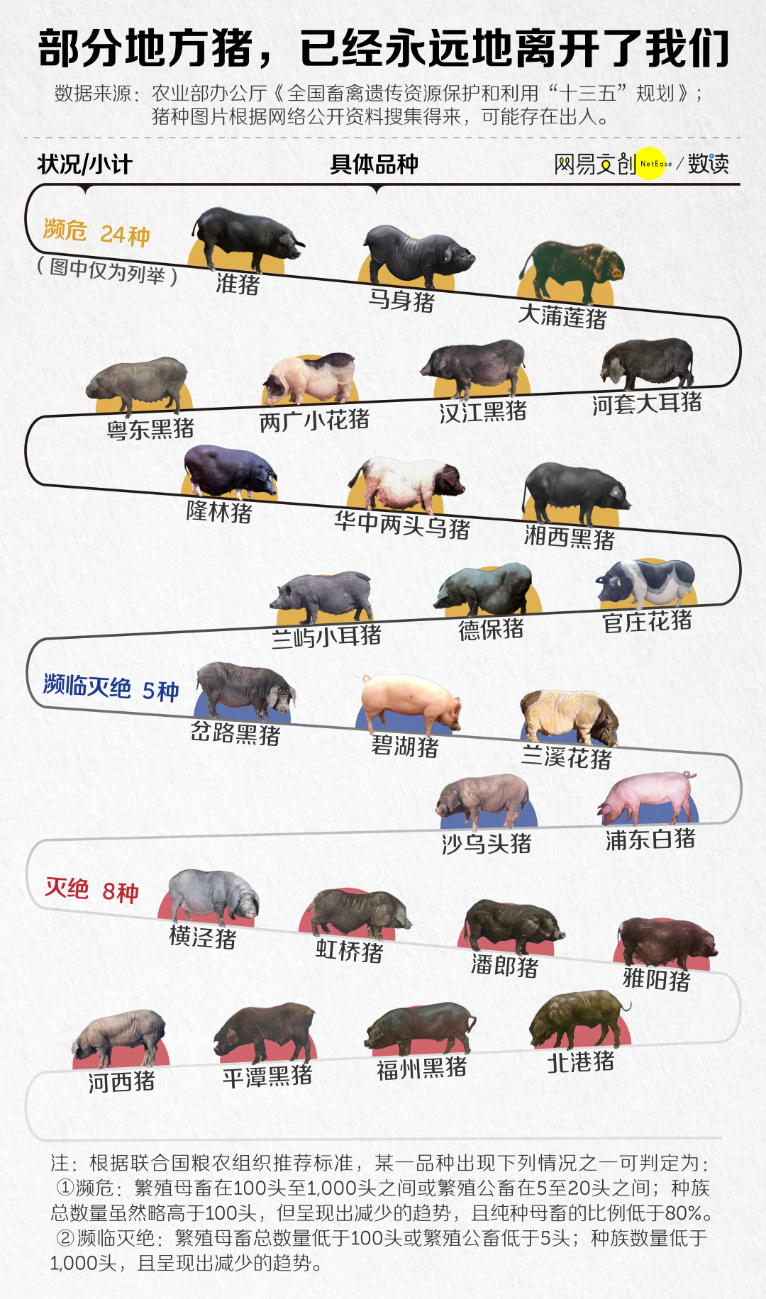 2017 年发布的《全国畜禽遗传资源保护和利用“十三五”规划》显示,横泾猪、虹桥猪、潘郎猪等 8 个品种已经灭绝 [24]。
