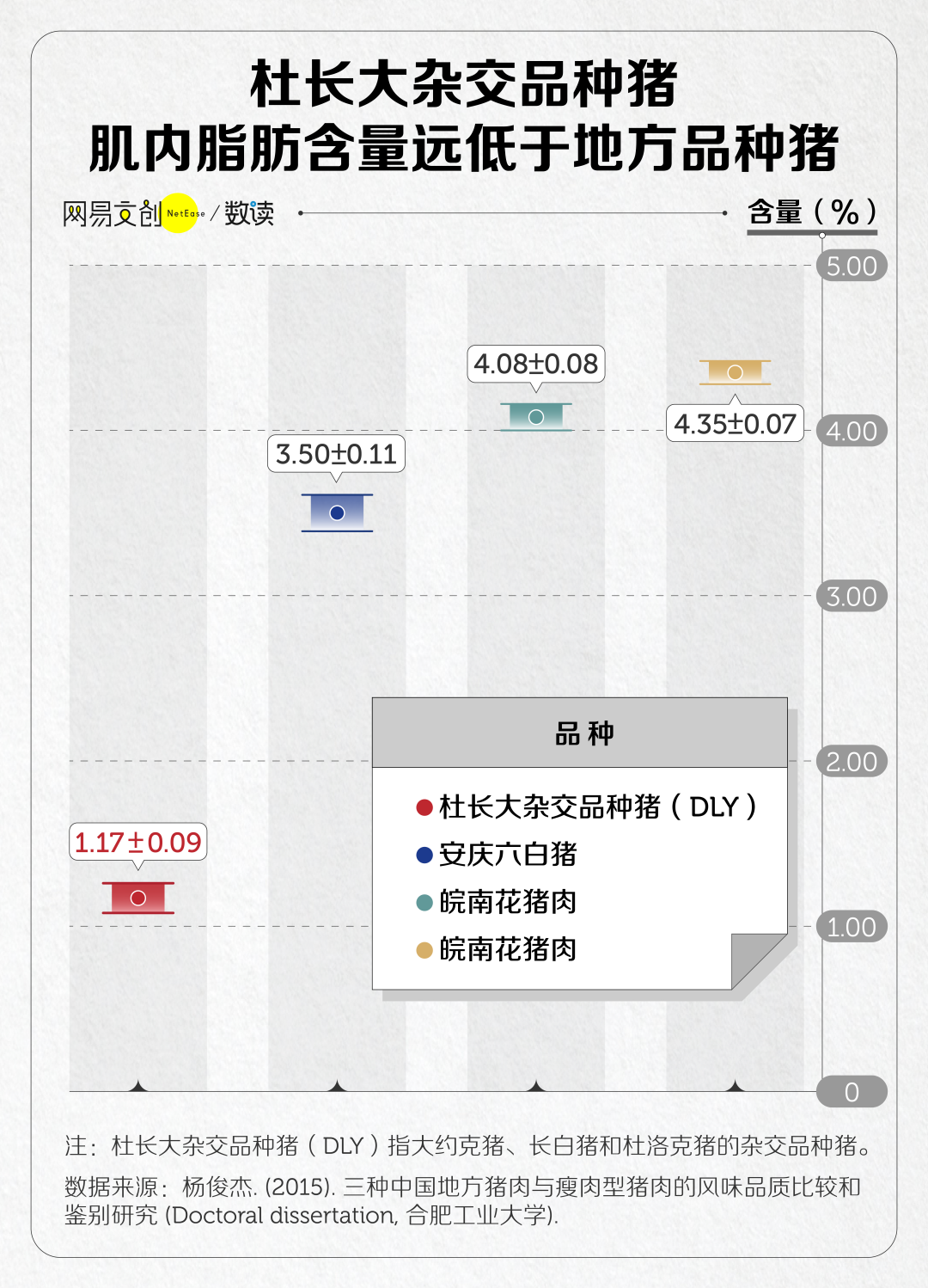 以杜长大杂交猪种(DLY)为例,在一项针对地方猪肉和瘦肉型商品猪肉的肉质比较研究中,它的肌内脂肪(IMF)含量仅为 1.17%,并且远远低于同组实验中的安庆六白猪、皖南花猪肉以及定远黑猪肉三个地方品种 [12]。