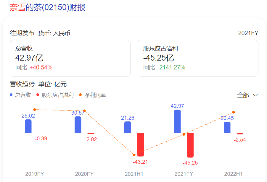 而作为新茶饮赛道中唯一的上市公司,据2022半年报显示,奈雪上半年收入20.44亿元,同比下滑3.8%,经调整净亏损2.49亿元,较去年同期的0.48亿元盈利大幅下降618.75%。虽然曾短暂有过盈利,但上市后的奈雪仍处于持续亏损的状态。