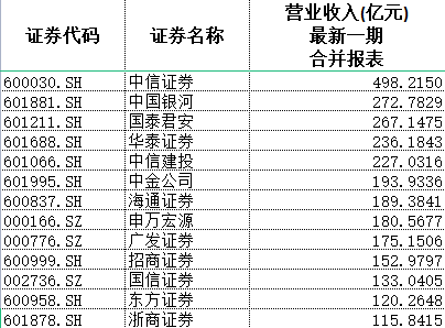 据东方财富Choice显示,2022年前三季度,共有中信证券、中国银河、国泰君安、华泰证券、中信建投、中金公司、海通证券、申万宏源、广发证券、招商证券、国信证券、东方证券、浙商证券13家券商的营业收入超百亿元。
