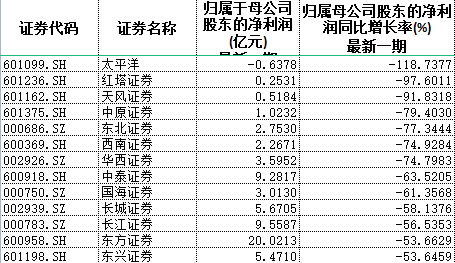 同比情况看,超九成券商机构前三季度的归母净利润同比下滑。其中,中泰证券、国海证券、长城证券等13家券商前三季度的归母净利润“腰斩”。红塔证券、天风证券、中原证券、东北证券、西南证券、华西证券的归母净利润分别同比下滑97.6%、91.83%、79.4%、77.34%、74.93%、74.8%。