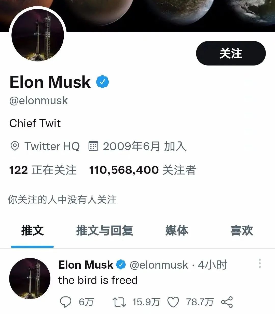 当地时间10月28日上午,特斯拉和SpaceX首席执行官埃隆·马斯克(Elon Musk)在其推特账号上发布了一条信息“这只鸟自由了。”,而推特的图标正是一只蓝色的鸟。