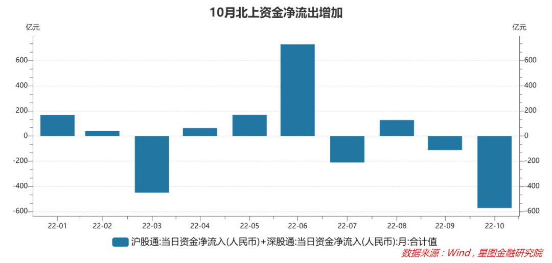 三是外资流出加速,对市场情绪产生压制。受美联储加息和人民币汇率波动等因素影响,北上资金加速流出,10月累计净流出573亿元,创年内月度新高。考虑到当前A股属于存量资金驱动市场,资金的边际净流入或净流出均会对市场均衡估值产生重要影响。从行业板块看,北上资金净卖出的板块主要集中在食品饮料、电力设备、银行、非银金融等,10月这些行业均录得下跌,其中食品饮料行业涨幅-22%,位居31个申万一级行业倒数第一。