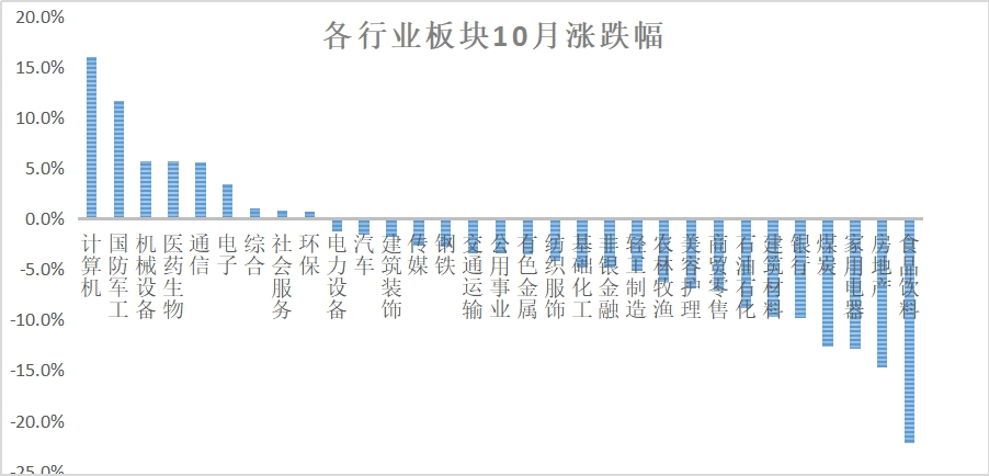 整体上看,10月份A股市场风险偏好很低,只有估值和预期双优的板块受到追捧,如医药(主要是医疗器械、中药和部分创新药标的)、信创(计算机、电子板块为主)、建筑防水等,估值都处于历史底部区域,且政策面拐点信号明显,基本面好转预期确定性高,受到资金追捧。除此之外的其他板块,要么属于“估值处于底部,需静待拐点因素”,由于看不到立竿见影的催化剂,资金抄底意愿不足;要么属于“基本面景气度不变,估值缺乏安全边际”,在遍地黄金的市场环境下,对资金吸引力下降。