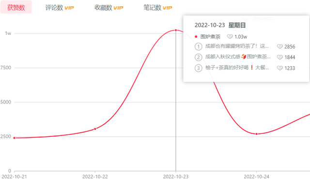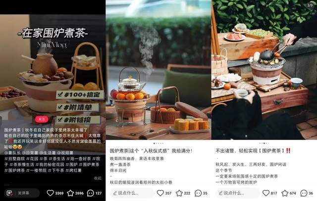 抖音上#围炉煮茶#话题的播放次数已达3.6亿次,#烤茶#话题的播放次数已达4424.7万次;小红书上#围炉煮茶#官方话题的浏览次数已达1154万,话题下写明“优质笔记将有机会获得官方流量扶持”,据新红数据平台统计,10月23日相关话题笔记的获赞数达到1.03万。