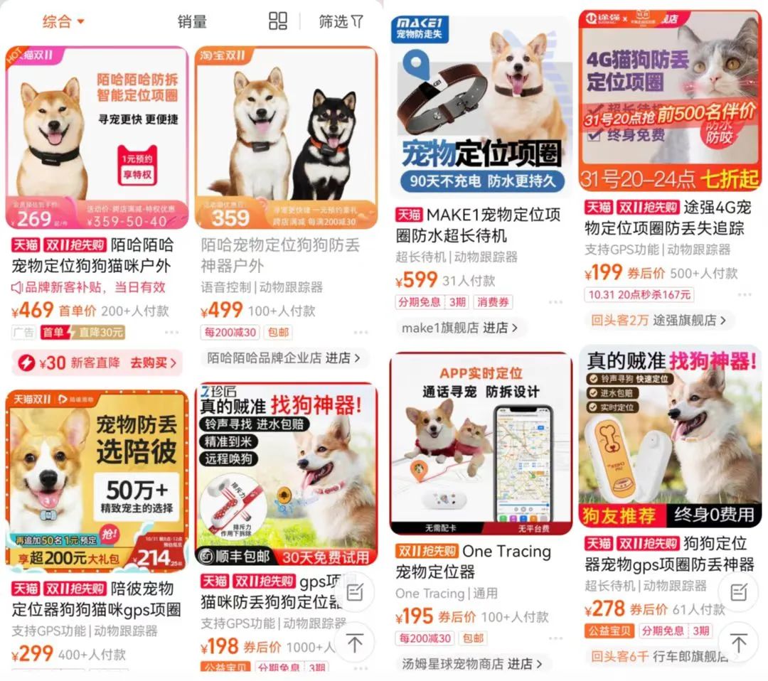 智能项圈,价格二百元至五百元不等。/购物软件截图