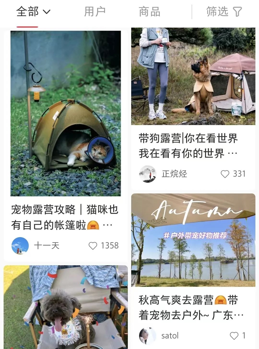 带出来露营的,大部分是狗,少部分是猫。在小红书上搜索“带着狗狗去露营”,话题有200多万次的浏览量,而“带着猫咪去露营”有18万次的浏览量。很多网友会晒出带宠物露营的美照,并分享心得。