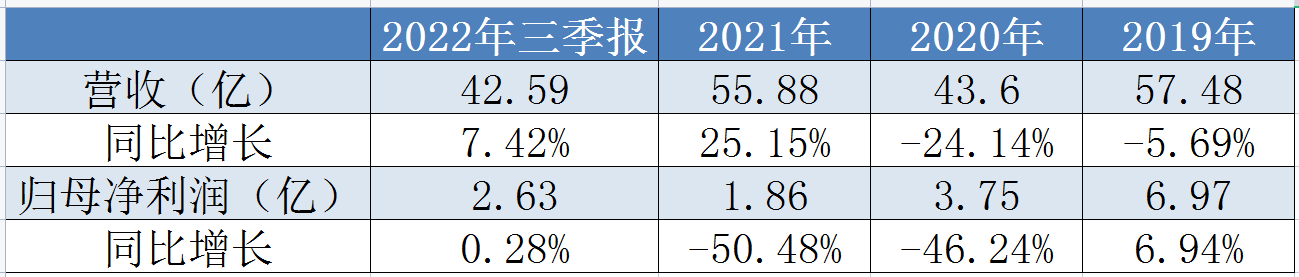 数据显示,近三年来业绩波动较大,2019年营收57.48亿、归母净利润6.97亿,同比增长-5.69%、6.94%,增利不增收;2020年起,归母净利腰斩,2020年、2021年归母净利分别为3.75亿、1.86亿,同比下降46.24%、50.48%,2022年前三季度公司业绩仅有小幅增长,营收、归母净利分别同比增长7.42%、0.28%,第三季度营收14.56亿元,同比增加11.5%;归母净利润为3919.9万元,同比增加2.39%。