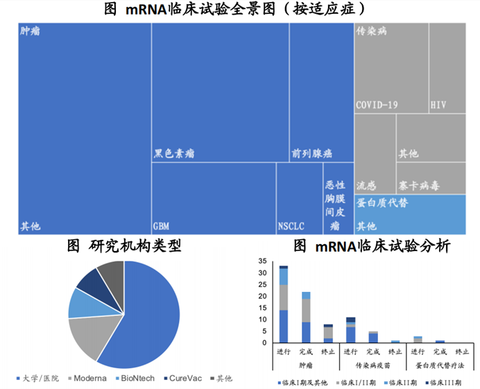 总的来看,肿瘤依然是mRNA企业的主攻方向,所有正在进行的mRNA临床试验中,有75%的临床是针对肿瘤适应症,HIV病毒、流感、寨卡病毒等传染病则是另一个重点研究方向。