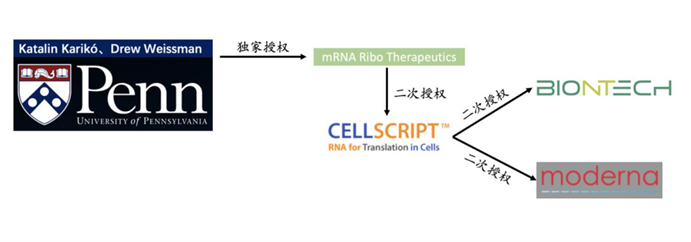 例如卡塔琳团队发现了 “假尿苷替换”技术 后,他们就很快申请了专利,随后他们所在的宾夕法尼亚大学又将专利授权给Cellscript公司,而Cellscript公司则将专利授权给了Moderna 和 BioNTech。