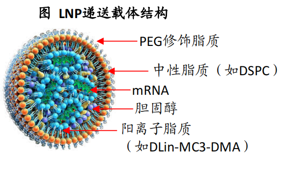 从结构看,LNP主要由 4 种物质组成:阳离子离脂质,中性辅助脂质,胆固醇,聚乙二醇(PEG)化脂质。阳离子脂质负责与负电的mRNA结合,中性辅助脂质能够在内吞时加快mRNA释放,胆固醇可以稳定LNP的结构,PEG则可以防止LNP的聚集。