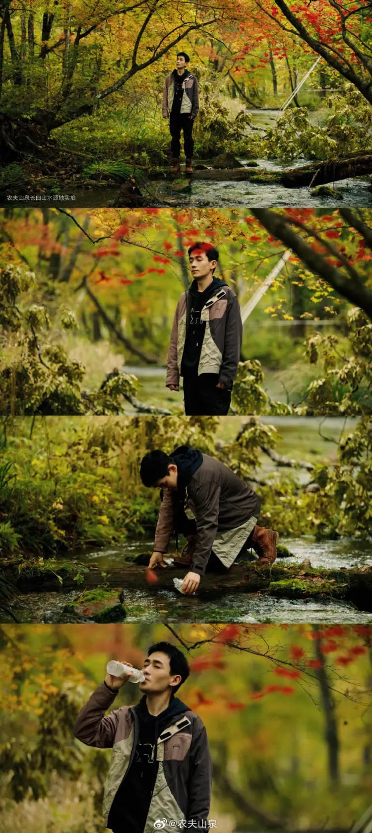 代言人朱一龙在农夫山泉·抚松工厂·长白山水源地实景拍摄宣传图。/@农夫山泉