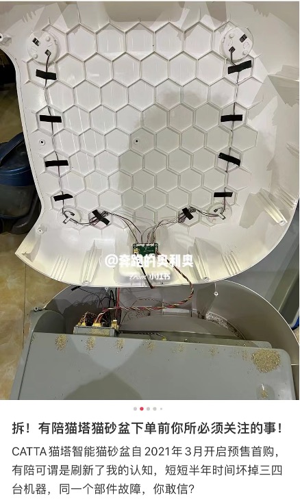 今年6月,有铲屎官在小红书上吐槽,有陪家的CATTA猫塔智能猫砂盆在短短半年内坏掉三四台机器,每次都是同一个部件出故障,可谓是刷新认知。保修期过后,智能猫砂盆又坏了,该网友就自行拆开机器,看看是什么情况。