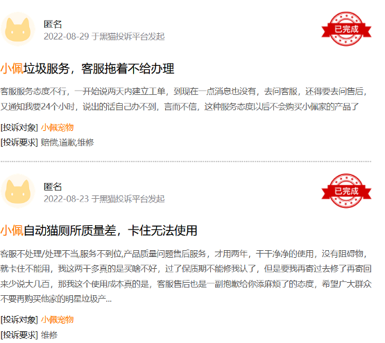 还有很多消费者诉诸黑猫投诉平台,主要涉及质量差、售后差等问题。不少人表示,在买有陪产品的一年内,不断换新,不断坏,产品缺陷始终不修复,非常磨人。在Catlink、小佩宠物的投诉页面,很多网友反映其售后服务不行,产品出现质量问题后,客服拖时间,不愿维修处理。