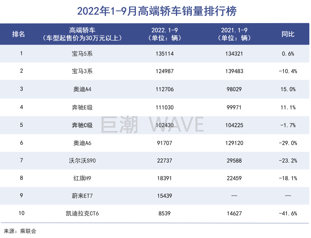 高端汽车消费出现了罕见的下跌。根据乘联会数据,今年1-9月高端轿车(30万元以上)销量排行前十中,有六款车型同比销量下降,仅有三款同比上升。