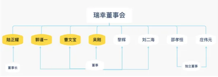 2020年6月20日,陆正耀组局召开瑞幸临时股东大会,主要议题有三个。第一,罢免自己的董事长职位。第二,解除黎辉、刘二海的董事任命。第三,解除独立董事。在这次股东大会之前,瑞幸的董事会构成如图: