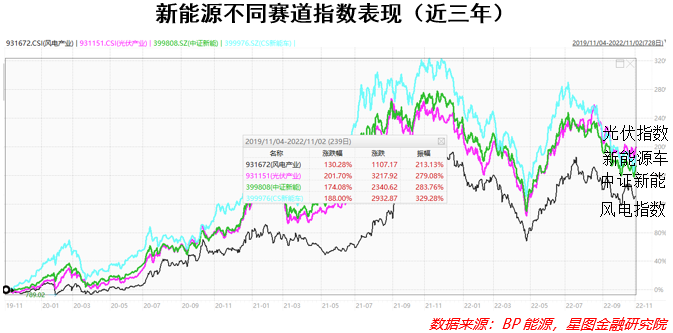 以近三年的时间看,包括光伏(931151.CSI)、风电(931672.CSI)、新能源车(399976.SZ)、中证新能(399808.SZ)几个新能源不同赛道指数的表现大致相同,但由于不同的新能源赛道技术成熟度和渗透率不同,因此在指数涨幅及波动幅度上也有所差异。
