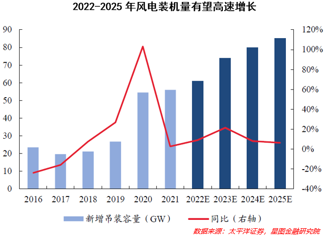 在“双碳”目标的确立下,风、光发电在电力结构中占比的提升是确定的,进而推动风电长期需求的增长。根据国家能源局规划,到2025年,风、光发电量的占比将达到16.5%。同时,在风电、光伏两种发电方式中,风电项目优于其经济效益更强,未来对于风电装机量的需求有望比光伏更高,也同样支撑风电装机量的进一步扩张。