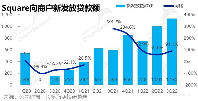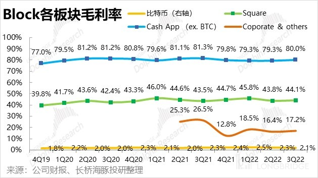 1、Square 板块实现毛利润 7.83 亿元,高于市场预期的 7.6 亿。剔除 Afterpay 贡献的亿毛利润后,可比毛利润同比增长了 17%。毛利率环比也由 43.8% 提升到了 44.1%。而市场则是预期毛利会环比下跌,这是超预期的主要原因。海豚君认为,毛利率改善的原因一是公司控制了投入,另外本季毛利潜力更高的贷款和服务性收入占比提升也是主要原因之一。