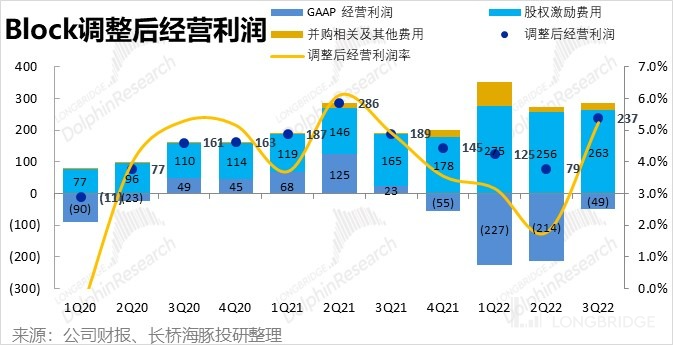4. 开始省钱,利润总算好转:毛利层面,Block 整体实现毛利润 15.7 亿美元,同比增长 38%。毛利率也由上季度的 33.4% 提升到 34.7%。毛利率提升的幅度也好于市场预期的 34.4%。分板块来看,Square 和 Cash App 板块的毛利率都环比有所提升。海豚君认为,两个板块内毛利率更高(高达 80%)的借贷等非支付业务表现强劲是毛利改善的可能原因。