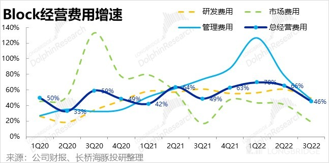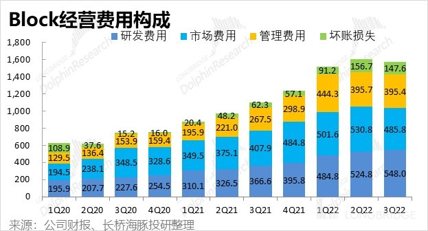 细分来看,管理费用支出和上季度基本持平,停止扩张;而市场营销费用再次是被最先缩减的费用,本季支出由上季的 5.3 亿减少到 4.8 亿。另外,当期科技公司 “再穷不能穷研发” 的铁律也依旧生效。本季 Block 的研发费用是唯一还在环比增加的。考虑到公司仍在推进 Afterpay 和现有 Square 和 Cash App 的融合,并持续推出新功能,研发费用增长也合情合理,何况研发费用同比增速也是放缓到了 49%。