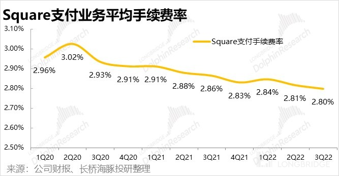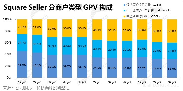 根据披露,年销售额在 50 万美金以上的中大型商户贡献 GPV 占比已经提升到近 40%,而年销售额不足 12 万的微型商户占比则在持续走低,公司逐渐摆脱 “低质商户” 并向大规模商户持续转型,这对 Square 板块的长期健康发展是个良好信号。