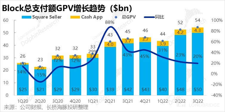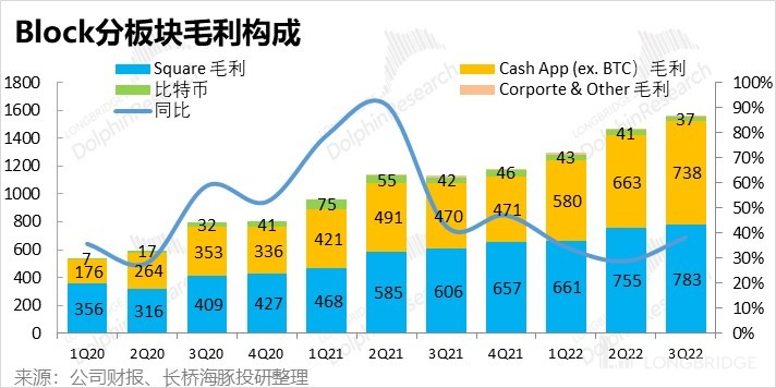与更随波逐流的 Sqaure 板块相比,在数字支付并不成熟的美国市场,面向消费者的个人移动钱包 Cash App 的增长更多是看渗透率提升的逻辑,因此对宏观经济周期的敏感度并不高,本季度也走出了逆势增长的表现。在剔除比特币交易业务后,本季实现营收 9.22 亿美元,高于市场预期的 9.08 亿。进一步剔除 Afterpay 并表的增量收入后,Cash App 可比营收增速为 41%,较上季度的 21% 大幅提速(虽有去年 3Q 基数非常低的利好),具体来看: