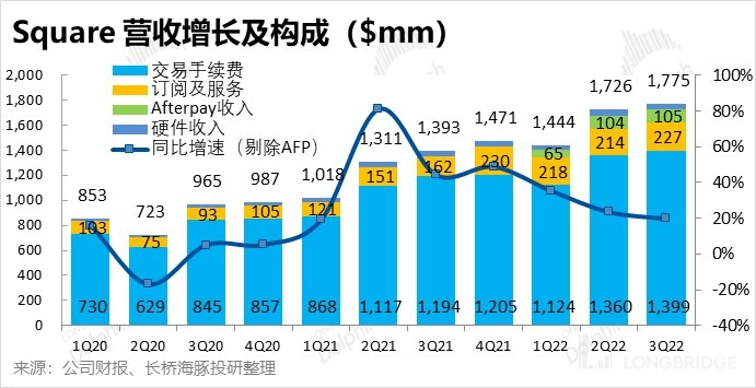 - 包括向商家提供 ERP/CRM 服务和资金贷款的订阅服务业务,在剔除 Afterpay 并表影响后收入 2.27 亿,同比增速仍达 40%,较上季度仅降速 1pct,基本止跌。可见基础支付服务外,额外的附加值服务才有更强的增长动力。