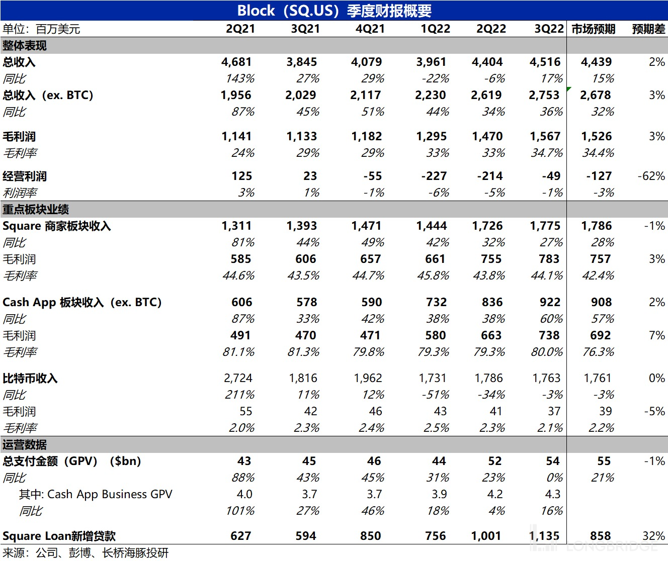 总的来看,在经济下行和消费疲软的大背景下,居民 (特别是收入较低人群) 的支出减少,因此服务中小型商户为主的 Square 业务增长在继续放缓,拖累了 Square 的支付收入,导致板块营收不及预期。但相对的,中大型商家的增长和重点发力的贷款业务,则进展不错,也更具逆周期的韧性。