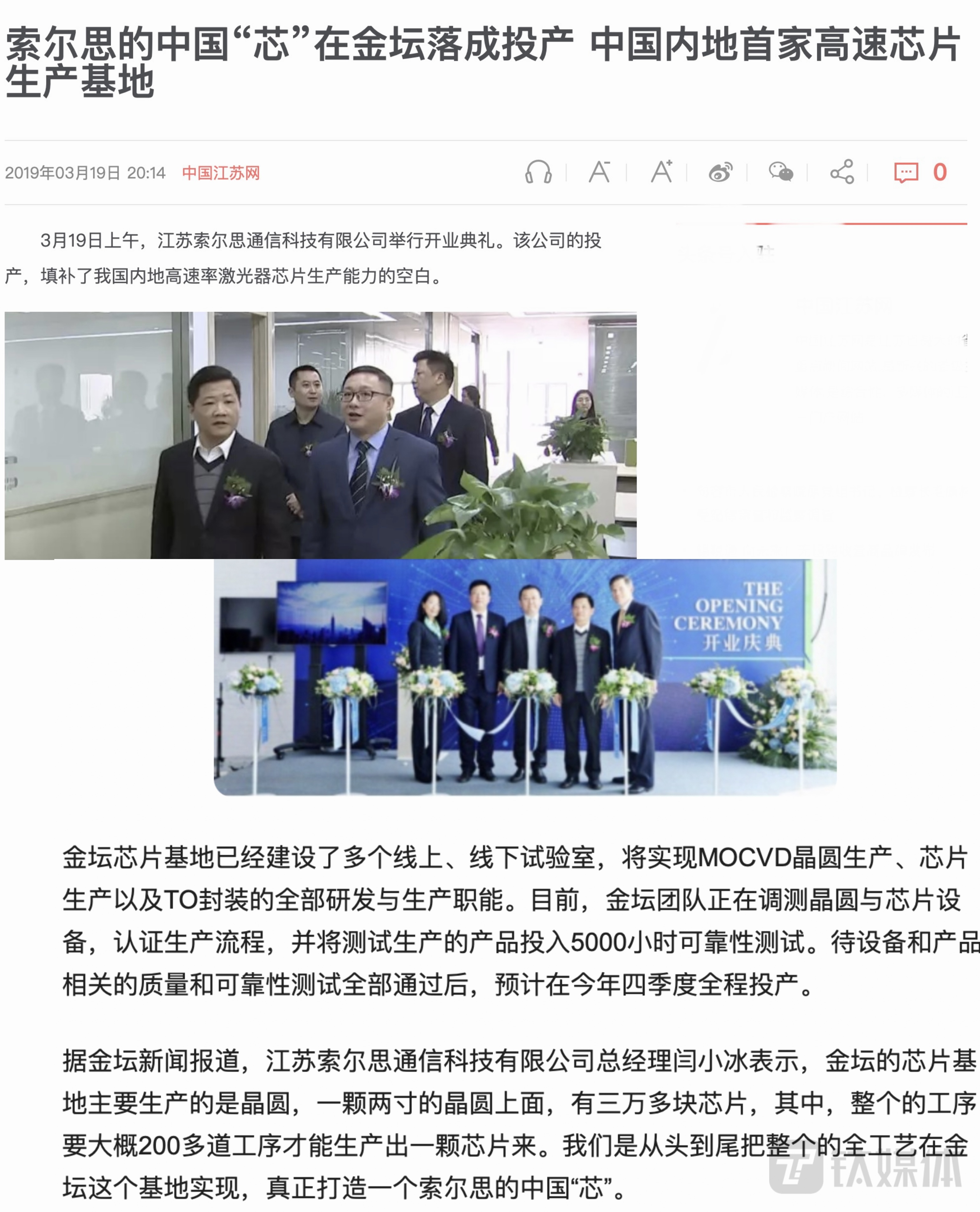 2017年索尔思光电宣布在江苏金坛市建设一座光芯片工厂,承接台湾晶圆厂的制造能力,2019年3月开业,被视为“填补了国内无高速率激光器芯片生产能力的空白。”
