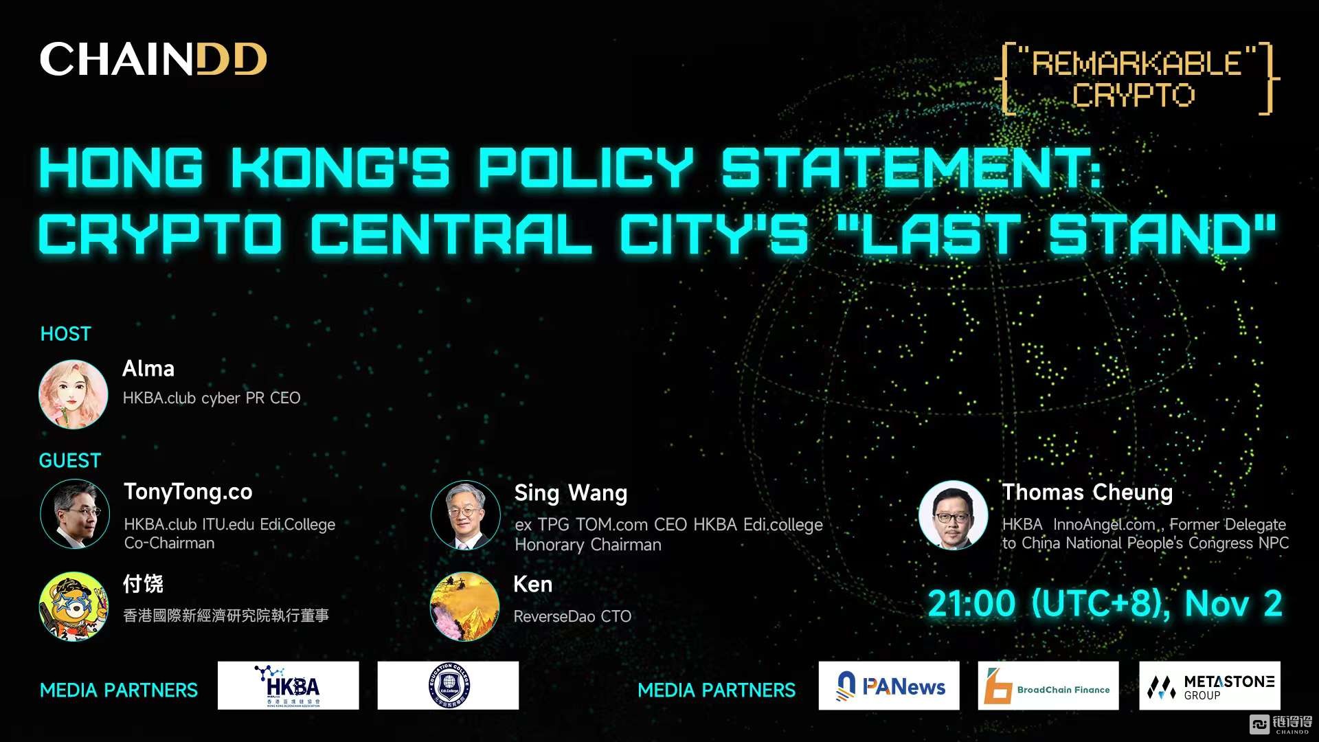 ChainDD特别邀请了一些来自香港地区的行业专家,包括香港区块链协会(HKBA.club)元宇宙教育学院(Edi.College)荣誉会长王兟先生,香港国际新经济研究院执行董事、诺富腾创始人付饶先生,HKBA荣誉主席张俊勇先生,香港区块链协会联合会长唐儀先生,香港本土创业企业代表、ReverseDao CTO Ken,并邀请到香港区块链协会秘书长 Cyber PR CEO Alma作为共同主持,一同解密香港新政,探寻监管靴子落地后,香港Crypto市场的机遇与挑战。