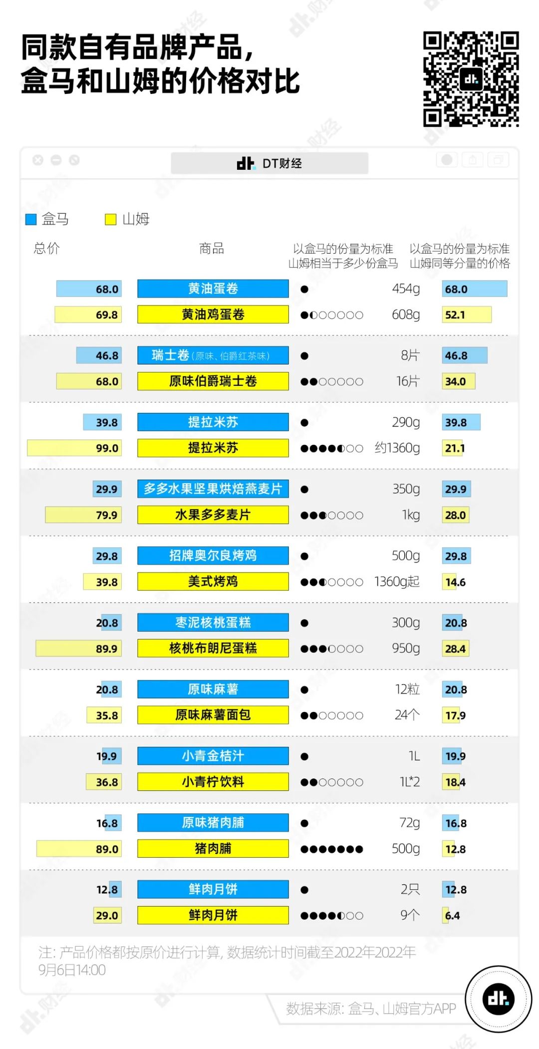 我们对比了盒马和山姆10款同款或相似的自有品牌商品(盒马&MM),发现以单价算,其中9款商品,盒马的价格都比山姆更贵。
