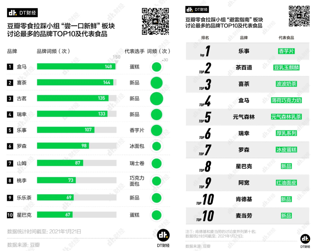 社交媒体上,讨论盒马的热度一直很高。在小红书上,在盒马种草、拔草都非常火热,#盒马必买#拥有近4000万浏览量。而在有26万组员的豆瓣“零食拉踩小组”,盒马也表现亮眼。DT财经曾统计发现,在近万条帖子中,盒马的产品力压一众新老大牌,热度位列组内安利板块第一、避雷板块第四,喜提“最有存在感品牌”大奖。