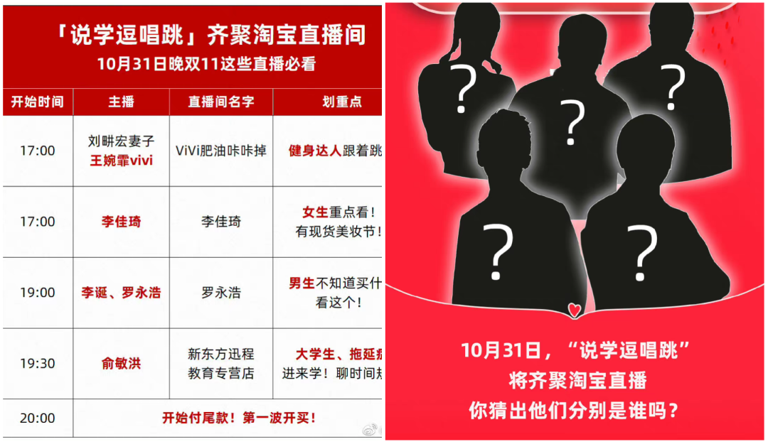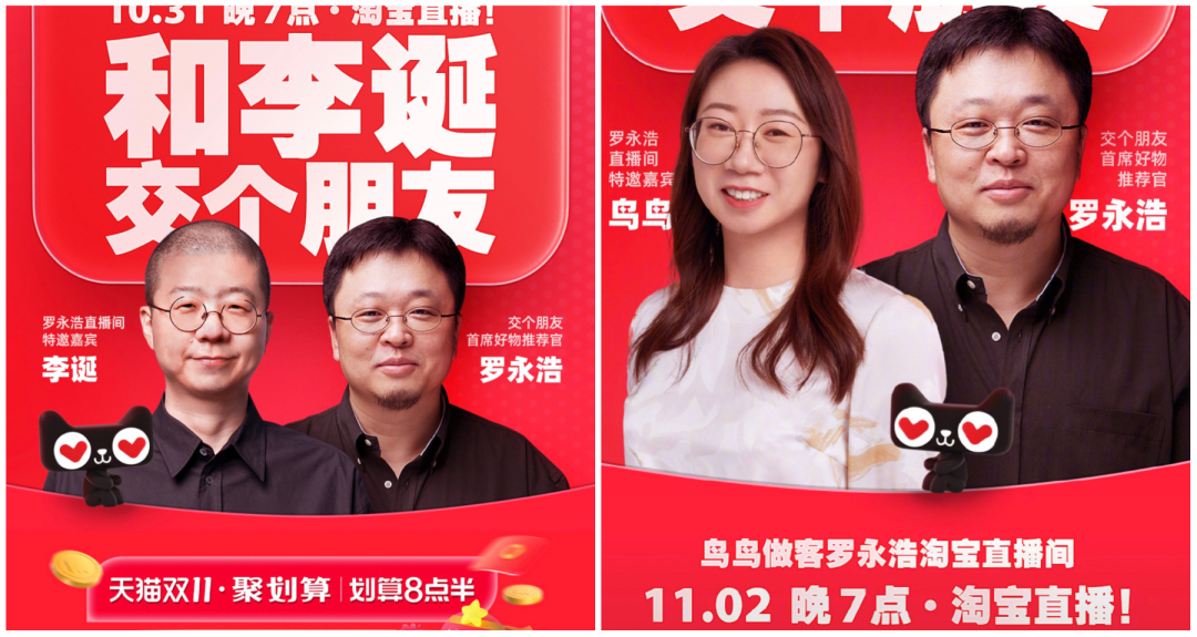 10月20日,罗永浩和其MCN交个朋友表示,将在双11期间于淘宝直播。随后不久,俞敏洪、刘畊宏妻子ViVi、刘思瑶等抖音系头部网红,先后官宣入驻淘宝直播。